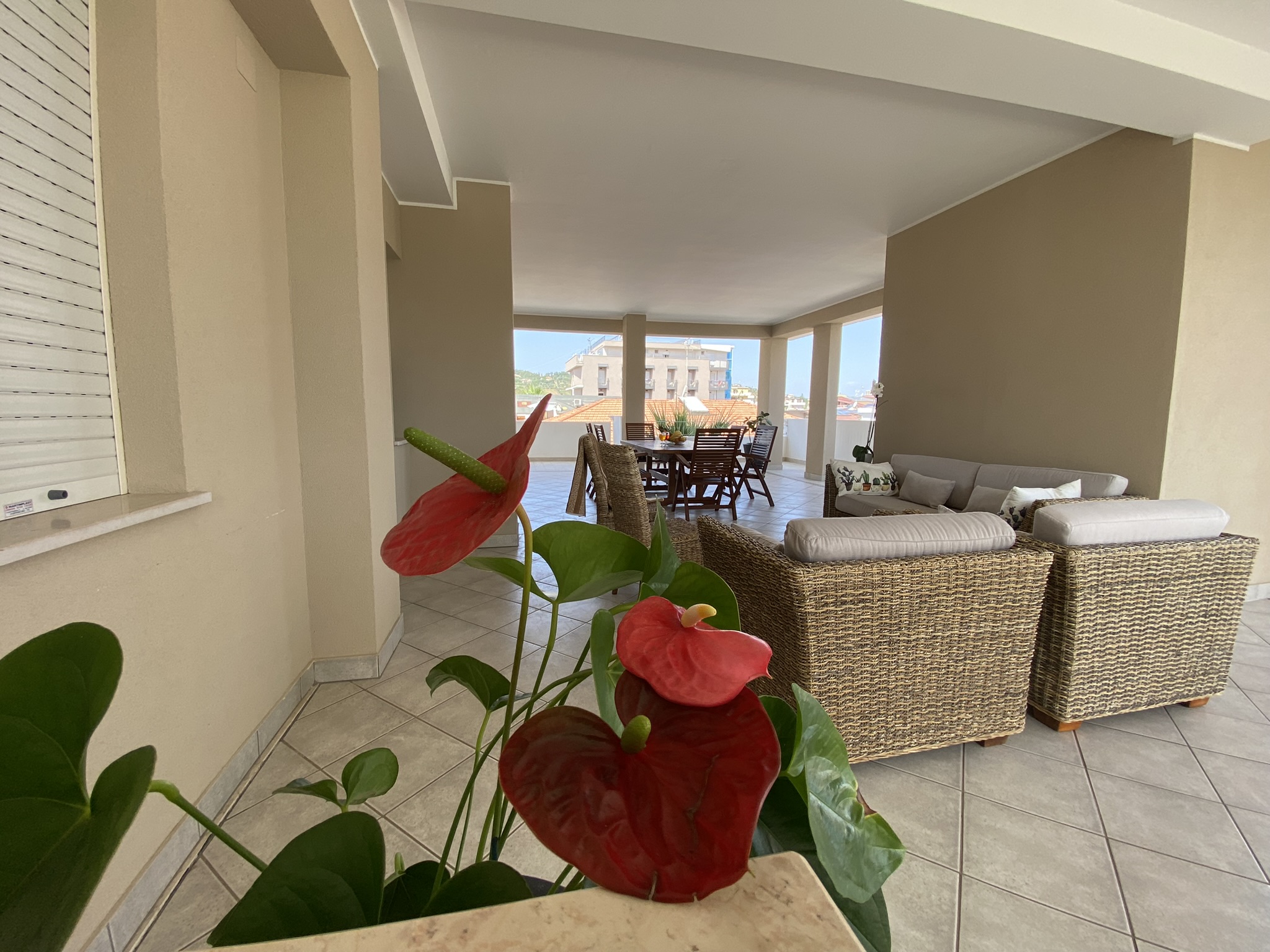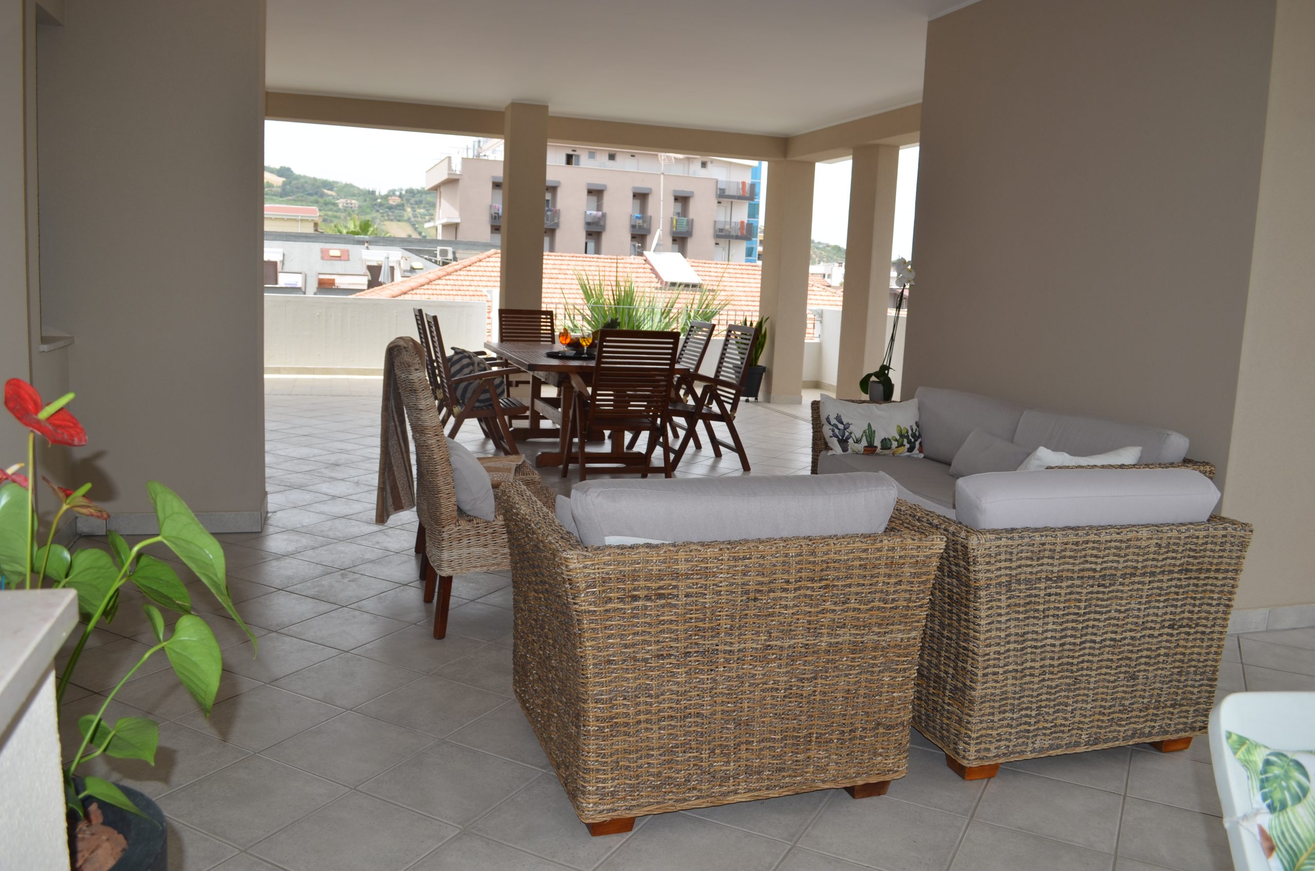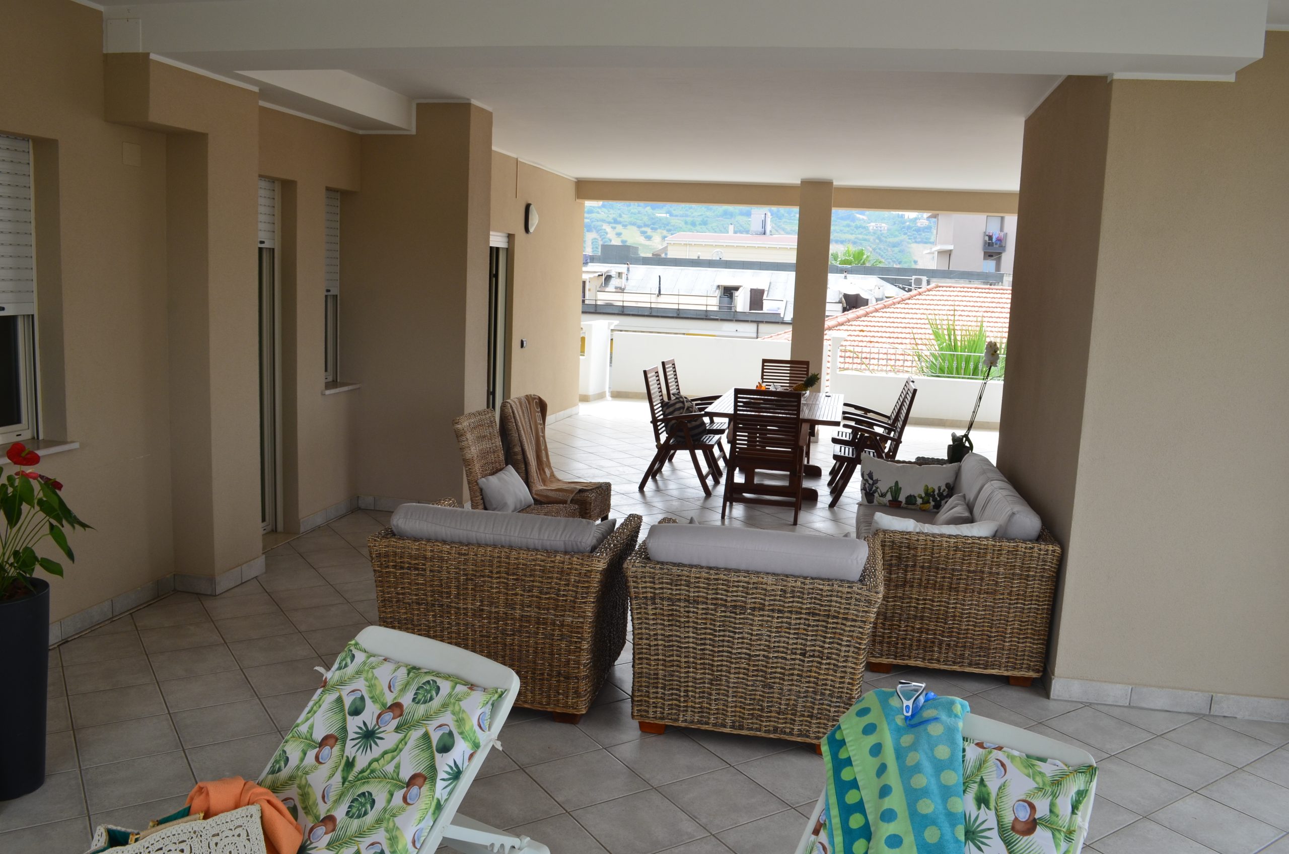 offre uno spazio meraviglioso, gigantesco e privato con un enorme terrazzo a porticato (circa 100 mq ) e ampia vista sul mare e pittoresche colline ad ovest. E’ attrezzato di tavolo e sedie da esterno per pranzare anche all’aperto, di poltrone e lettini per relax, utile stanzino di sgombro, comoda vaschetta per lavare e stendibiancheria completo di mollette.