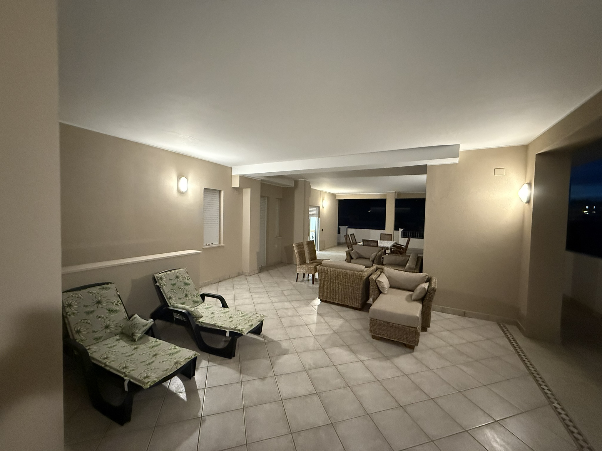 Zona esterna di circa 150 metri quadri, offre un luogo gradevole e privato con un grandissimo terrazzo e porticato attrezzato di lettini prendisole e tavolo da giardino con sedie